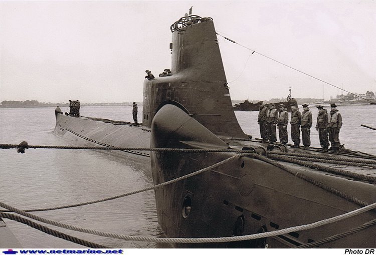 Le sous-marin Espadon appareille pour une croisière polaire en mer de Norvège, qui le conduira jusqu'au parallèle 70°Nord. Des protections pour les aériens ont été mises en place en haut de la cathédrale et sur le sonar avant. Au premier plan , le Marsouin qui va le suivre dans cette aventure. Cette mission permettra de préparer l'opération « Sauna » l'année suivante, pendant laquelle le Dauphin et le Narval resteront une dizaine de jours au 72°N en naviguant ponctuellement sous la banquise (28 avril 1964 - Photo Roger Barthelet).