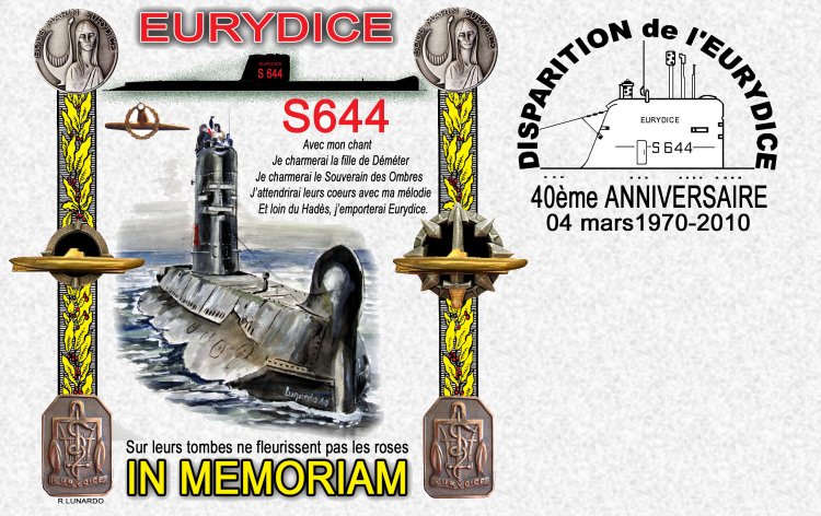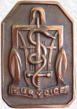 Motif symbolique : Rectangle blanc soutenu par une ancre à pattes articulées noire, et chargé d'une harpe d'or, d'une épée du même et d'un serpent noir. La harpe est l'attribut d'Orphée, époux d'Eurydice. Le serpent est celui qui piqua mortellement cette dernière. Motif non homologué. |