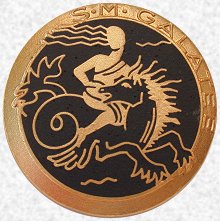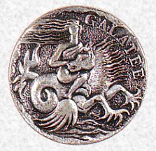 Motif symbolique : Rondache noire à dessins d'or représentant la Néréide Galatée montée sur un cheval marin. Motif non homologué. |