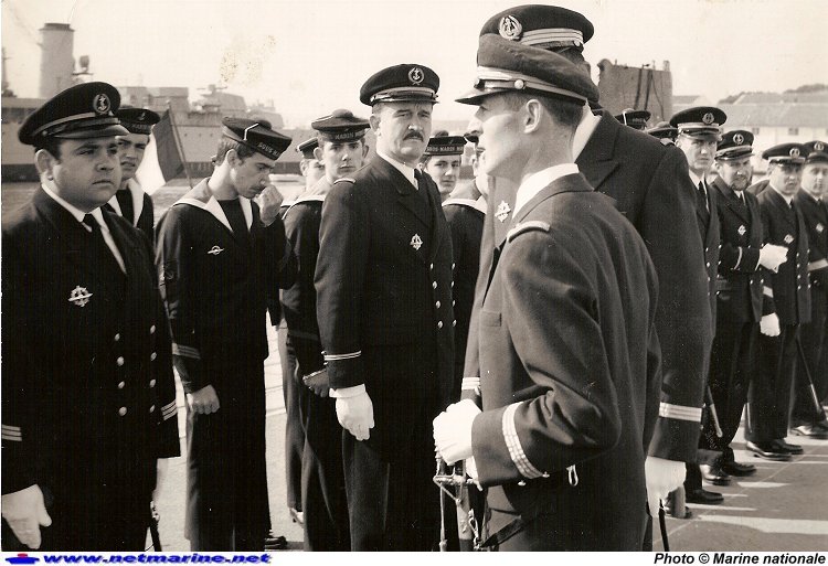 Le lieutenant de vaisseau Philippe Morel passe l'équipage en revue, le jour de sa prise de commandement du sous-marin