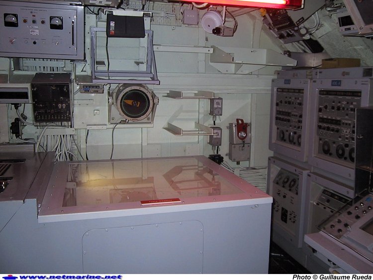 ![]() Face avant tribord du PCNO (poste Central Navigation Opérations) du sous-marin nucléaire lanceur d'engins Le Redoutable à la Cité de la Mer de Cherbourg. Au premier plan la table traçantes et différents appareils de détection (mai 2002).