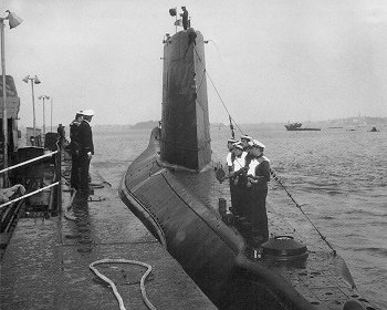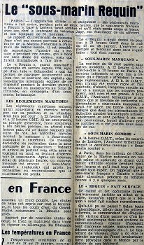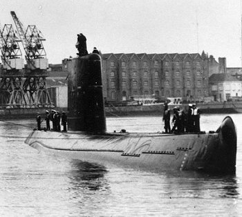 Le 29 mai 1958, le Requin quitte Lorient, puis plonge aussitôt et ne refait surface que le 9 juillet au large des Açores, après 42 jours passé sous l'eau. Quant au Dauphin, parti de Cherbourg le 7 juin, il remonte ce même 9 juillet à la surface non loin de la zone où se trouvait le Requin, après 32 jours de plongée ininterrompue. A bord du Requin et du Dauphin se trouve un équipage de 60 hommes dont 7 officiers et un médecin, exceptionnellement embarqué pour suivre le comportement de l'équipage et fournir les soins éventuel. Les précédents records avaient été établis par deux sous-marins américains à propulsion nucléaire, les USS Skate et Sea Wolf après 30 jours de plongée. Le sous-marin est admis au service actif le 1er août 1958, il sera affecté à Lorient-Kéroman la quasi totalité de sa carrière (août 1959 à août 1980). Début 1961, il effectue son premier grand carénage à Lorient. Le 26 septembre 1962, le Requin est abordé par le chalutier Tamiz (quelqu'un en sait plus sur cette fortune de mer ?). Le 28 janvier 1963, il est en manoeuvre au large de l'Irlande avec un sous-marin britannique, quand un problème de communication le contraint à rester silencieux plusieurs heures. Les messages réglementaires SUBMISS (sous-marin manquant) puis SUBSUNK (sous-marin coulé) sont alors envoyés, mettant l'état-major puis les familles en émois. Heureusement, le Requin fera surface quelques heures plus tard sans dommage. Le 1er avril 1963, un accident avec le chalutier de Lesconil La Berceuse sera relaté le lendemain dans « Le Télégramme de Brest » et « La Liberté du Morbihan ». Le chalutier La Berceuse se trouve alors à 12 milles dans le sud-sud-ouest de Groix. Il vient de filer le chalut et 200 mètres de funes, lorsque le patron, Mr Louis Primot donne l’ordre de stopper, les panneaux semblant s’être pris dans la vase. Soudain, le chalutier effectue un sec quart de tour sur lui-même, tandis que l’eau l’envahit jusqu’à la passerelle. Le patron donne alors l’ordre de laisser filer la fune arrière, jusqu’à sa sortie du treuil. A peine en effet cet ordre est exécuté que le navire est entraîné à quelques 10 à 12 noeuds. Nouvel ordre du capitaine : « Lâcher tout et une fois le treuil à vide, mettre une bouée à l’eau en vue de sauver tout ce qui pouvait l’être ». Si La Berceuse, peu fidèle à son nom, vient ainsi de danser la gigue pendant de folles minutes, c’est qu’elle vient de faire une prise sensationnelle : Ni plus ni moins que le sous-marin Requin, qui venu de Lorient, effectue des exercices dans les parages. La Berceuse parvient toutefois à regagner son port d’attache. Le 30 juin 1964, le Requin quitte Toulon, puis arrive à Lorient le 14 juillet pour entrer en grand carénage. Il y reste jusqu'en décembre 1964. 1965-67 : Refonte à LorientLe Requin est le premier des sous-marins de type Narval à entrer en refonte à Lorient le 16 février 1965. A cette occasion, les diesels Schneider sont débarqués et remplacés par trois diesel SEMT Pielstick 12PA4-185 pour la propulsion diesel-électrique en surface. Les tubes lance-torpilles arrière sont supprimés, et un sas est créé. Un nouveau kiosque caréné est mis en place, ainsi que de nouveaux sonars. Les ailerons et barres sont modifiés. L'équipement électronique de détection est rénové. Au total 900 000 heures de travail seront nécessaires pour effectuer ces travaux. Le Requin servira en fait de prototype pour la refonte de la série. Il sort de refonte en juin 1967, mais les essais se prolongent jusqu'en décembre 1967. 1968 : A la recherche du sous-marin USS Scorpion Le 12 avril 1968, il quitte Lorient pour une croisière d'endurance dans l'Atlantique Nord, au cours de laquelle il effectue différents exercices nationaux et interalliés. Le Requin fait escale à Halifax, New London et Ponta Delgada. Au cours de cette croisière, le 22 mai 1968, le Requin est alors en escale à New London, lorsqu'une tragique nouvelle va modifier profondément son programme d'activité. La marine américaine vient de perdre la trace d'un deuxième sous-marin nucléaire d'attaque, l'USS Scorpion, à 300 nq au sud-ouest de l'archipel des Açores et dans une zone où la profondeur maximum est de 3 000 mètres. Le Requin quitte New London le lendemain pour rallier Ponta Delgada et participer aux recherches du bâtiment disparu. Lors de cette campagne de recherches, il est rejoint par le bâtiment expérimental USS Compass Island. Le Requin ne rallie son port d'attache de Lorient que le 13 juin, après que l'USS Scorpion ait été déclaré définitivement perdu. C'est le deuxième sous-marin que la marine US perd en mer après la disparition de l'USS Tresher en avril 1963. Un exercice de lutte anti-sous-marine a lieu du 13 au 16 avril 1970.