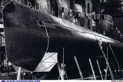 On le voit en escale à Dunkerque avec le Vauquelin du 12 au 16 mai 1977, ainsi que le 11 novembre de la même année (Dunkerque : ville marraine ?). 1979 : Pris dans les filets d'un chalutier ! Au premier semestre 1979 (date exacte inconnue), l'Apollo, un chalutier du Guilvinec en bois de 15 mètres, avec à son bord 4 hommes, connait une belle frayeur en crochant accidentellement dans ses filets le Requin. vers 11 heures du matin à 80 mètres d'immersion en exercice en mer d'Iroise. Heureusement le bateau ne chavirera pas. L'Apollo joue de malchance puisque 5 ans après, le même type d'accident se produira avec un des sister-ship du Requin : le Morse. Mais à partir de 1980 et jusqu’à son retrait du service actif, il va servir de sous-marin d’expérimentation du système d’armes tactiques (SAT). Sa transformation de sous-marin d’attaque en sous-marin d’expérimentation nécessite une grande refonte qui a lieu à Lorient de juillet 1979 à septembre 1980. Il a alors, une physionomie et une activité bien différentes de celles qu’on lui connaissait depuis sa mise en service. Une campagne d'essais à Toulon au GERDSM (Groupe d'Etudes et de Réalisation de Détection Sous-Marine) a lieu pour tester le sonar multifonction des SNLE refondus M4, notamment celui de L'Inflexible. 1996 : Coulé comme cible de tir Désarmé à Toulon le 1er novembre 1985, il est un temps stationné dans la darse des sous-marins, puis peu après sa condamnation le 26 juillet 1988 (décision 24545/DEF/C 22), il est ensuite mis au mouillage de Brégaillon. Sa coque, qui a pris le numéro Q656, est coulée comme cible de tir le 31 mai 1996 (par qui et comment, mystère... Quelqu'un sait ?) Net-Marine © 2008. Copie et usage : cf. droits d'utilisation. Remerciements Patrick Du Cheyron, Franck Dubey, Serge Pelois, Michel Gandois. Si vous souhaitez compléter cet historique (activité, escales, anecdotes, etc...) : Ecrivez nous. |