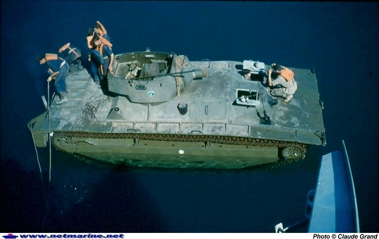 Un char amphibie (Alligator ?) prêt à embarquer à bord du bâtiment de débarquement de chars (BDC)