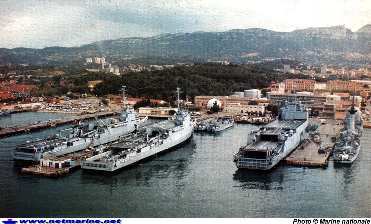 et 3 chalands de débarquements à quai devant le bâtiment d'état major de la