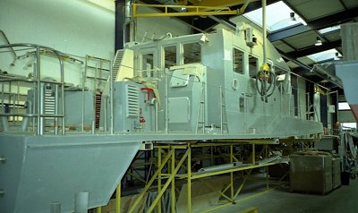 à la VCSM en vue de leur assemblage. Sur la partie droite, la coque est garnie de ses cloisons et de ses aménagements intérieurs. Les moteurs et les éléments techniques sont placés. Certains gros aménagements telles les caisses à eau douce sont placés définitivement et ne seront plus démontables une fois le pont mis en place. La coque est ensuite pontée. Ces opérations terminées, l’ensemble avance d’un cran dans la bâtiment afin de recevoir les derniers éléments composés par la mâture, les vitrages, et l’appareillage électronique. ![]() A