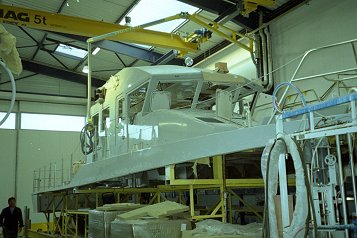 L’unité de production des vedettes côtières de surveillance maritime est implantée à L’Herbaudière, un petit port de pêche situé au nord de l’île de Noirmoutier. L’ampleur du programme a été une providence économique pour la région. Il a nécessité la construction d’un deuxième bâtiment constituant le module de montage des vedettes, ainsi que l’emploi de soixante-cinq ouvriers supplémentaires. A L’Herbaudière, les bâtiments du chantier CNB se trouvent à proximité immédiate du port derrière la criée. Ils représentent une infrastructure dorénavant constituée par deux grands halls disposés en enfilade. Le plus ancien comporte l’atelier de stratification et la menuiserie, tandis que le nouveau bâtiment sert au montage des vedettes et abrite le bureau d’étude. La VCSM est composée de trois parties principales moulées d’un seul bloc : la coque, le pont et le roof. Le moulage est effectué dans le premier bâtiment. La coque est réalisée en matériaux composites verre/résine par moulage au contact dans un moule femelle. Démoulée la coque est ensuite retournée pour le renforcement de la structure et la finition au gel-coat.