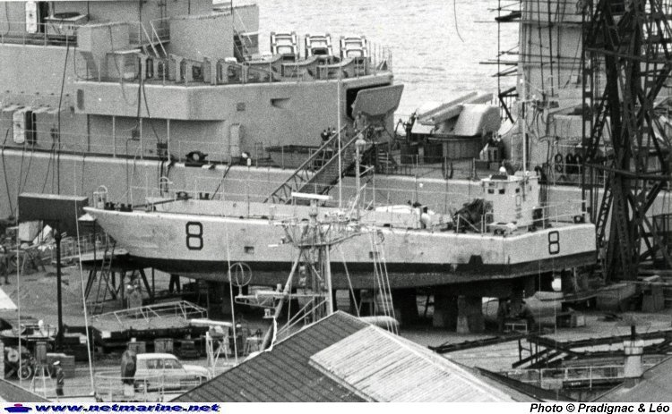au sec pour entretien dans l'arsenal de Lorient. Au premier plan on aperçoit la mature du BSM
