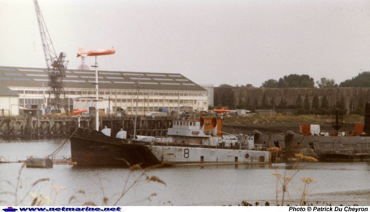 ![]() Le CTM 8 attendant la démolition au fond du Scorff dans l'arsenal de Lorient. En arrière plan on aperçoit des maquettes de missiles mer-mer utilisées pour le test des fusées de proximité au sein du GERBAM (Groupe d'Etudes et de Recherches Balistiques sur les Armes et Munitions) implanté en prequ'île de Gâvres (19 juillet 1984).