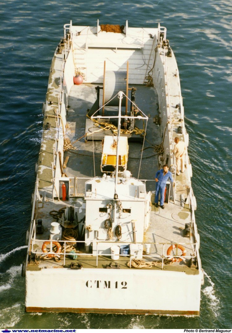 passant sous le pont de Recouvrance à Brest. On remarque le touret dans la cuve destiné à récupérer les antennes linéaires des sous-marins et le guide installé au sommet de la porte d'étrave (8 août 1989).