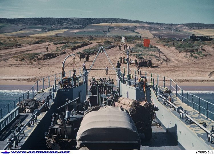 Plageage de l'EDIC 9094 sur la côte algérienne, dans la région d'Arzew. On peut noter que le 1er véhicule à débarquer sera le bulldozer chargé de dérouler un "tapis" sur la plage afin d'éviter l'enlisement des véhicules (1961 - photo Jean-Pierre Thubert).
