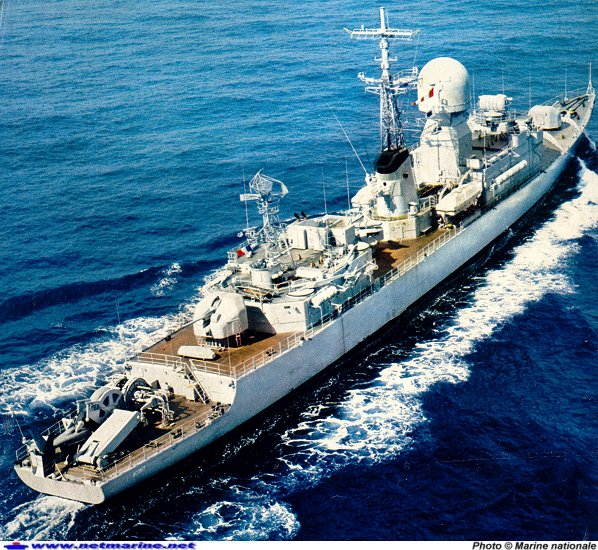 La frégate Aconit en essais. Il n'y a pas de système de guerre électronique (pas de syllex ni détecteur de radar). A noter la couleur du "poisson". ce n'est que quelques temps après que la Marine adoptera une couleur blanche. A cette époque, comme les bulbes de sonar de coque les VDS ne sont pas en composite mais métalliques (1971).