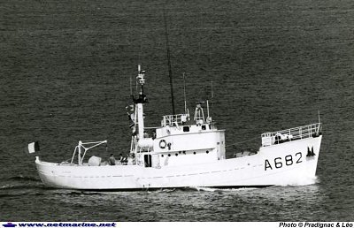 3ème d'une série de 5 unités de 24 mètres destinées à l'armement des Chalutiers Cherbourgeois, l'Evelyne Marie est mis à flot aux Constructions Mécaniques de Normandie le 12 avril 1952. Bateau moderne, il est conçu pour ménager la peine des hommes. Début 1962, la mise en service à Lorient du premier pêche arrière français, le Paris-Bretagne, rend rapidement obsolète les chalutiers classiques c'est-à-dire les navires travaillant par le côté. Avec le Michel-Marie, futur Octant, la marine nationale rachète l'Evelyne-Marie en 1962 à Félix Amiot qui, en plus du célèbre chantier naval, possède l'armement Cherbourgeois. Baptisé Alidade le 1er juin 1962, le bâtiment annexe hydrographique N°1 entre en refonte dans le chantier qui l'a vu naître une décennie auparavant. Débarrassé de ses apparaux de pêche, il se voit doté d'un nouveau bloc passerelle abritant notamment de nouveaux logements, des locaux techniques et des équipements scientifiques. Relancé au slip-way des Mielles le 15 novembre 1962, jour d'entrée en armement pour essais, Alidade est admis au service le 11 avril 1963. Affublé du numéro de coque P682, le bâtiment hydrographique est affecté à Cherbourg et intégré à la mission hydrographique des côtes de France. Avec Octant, ils vont ratisser inlassablement la Manche et la Mer du Nord, mettant à jour les cartes des fonds marins datant pour la plupart du 19ème siècle. Ce travail est primordial car de nombreuses épaves dangereuses ont été immergées au cours du second conflit mondial. Par décision du 15 juin 1965, Alidade est reclassé bâtiment hydrographique de 2ème classe, le numéro de coque A682 remplaçant le P682. Des missions particulières viennent parfois entrecouper les relevés de fonds habituels. L'année 1965 voit notamment sa participation à l'étude des courants et marées en mer d'Iroise. En 1968, il part provisoirement à Toulon pour participer avec Octant et La Recherche à la localisation de l'épave du sous-marin Minerve tragiquement disparu au large du cap Sicié le 27 janvier de la même année. Le 1er août 1972, Alidade abandonne définitivement les rivages de la Manche pour être affecté à la MOM (Mission Océanographique de la Méditerranée) stationnée à Toulon. Rejoignant Octant, Origny et La Recherche, il reprend ses travaux hydrographiques côtiers. Doté d'équipements scientifiques devenus obsolètes, le petit navire est reclassé bâtiment de surveillance sites en 1978. Il est désormais chargé de la surveillance des différentes zones maritimes d'entraînement autour de Toulon. Usé et la coque en bois très fortement attaquée par les mérules, l'ex Evelyne-Marie est désarmé et placé en réserve spéciale en janvier 1979, mois de la dernière cérémonie des couleurs. Condamné le 16 décembre 1981, débaptisé et désormais devenu le Q619, il reste en attente au cimetière marin du Brégaillon situé au fond de la rade de Toulon. Le 26 mars 1982, l'ancien navire hydrographique sombre dans les profondeurs de la Grande Bleue après avoir servi d'entraînement au pétardage pour les équipes du 3ème GPD (Groupe de Plongeurs démineurs).
