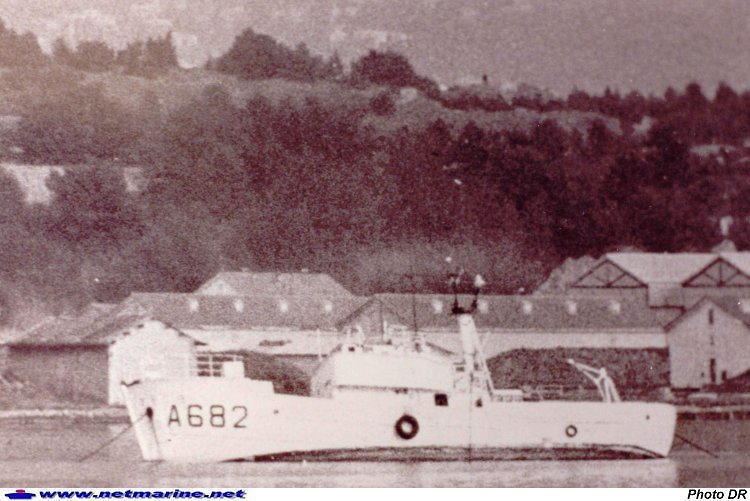 en bien mauvaise posture au cimetière marin du Brégaillon! Le 26 mars 1982, il sera coulé lors d'un entraînement au pétardage par des plongeurs démineurs (février 1982 - Photo Marc Saibène).