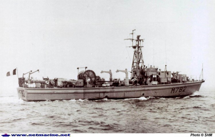 Le dragueur de mines Capucine devant le port d'Ostende en Belgique. Le bâtiment est très proche de sa configuration d'origine avec la passerelle totalement découverte (1960).