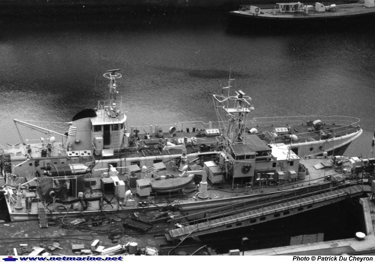 ![]() Le bâtiment auxiliaire Capucine en période d'entretien dans la Penfeld à Brest. On remarque le "youyou" sur son berceau à la place de l'ancien tambour de dragage et le compas de relèvement destiné à entrainer les élèves. A couple est amarré le transport de personnel Sylphe (7 avril 1983).