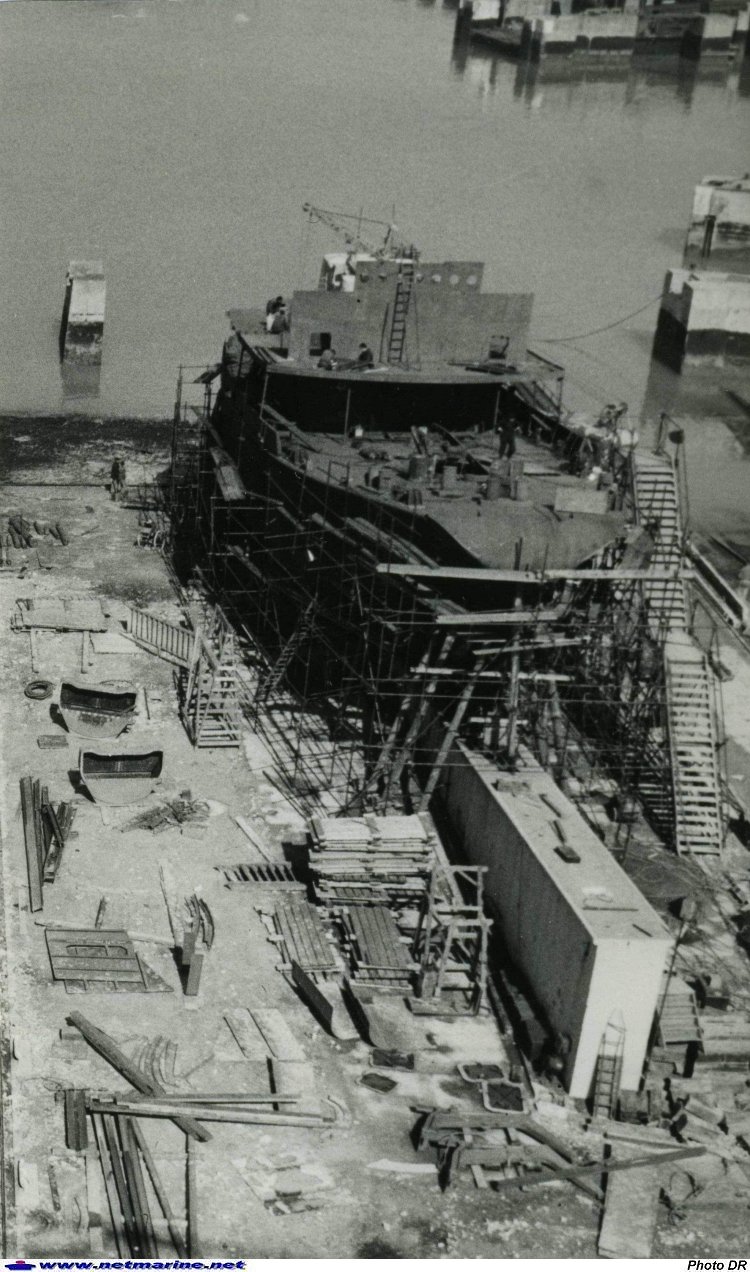 en construction sur sa ligne de tins à La Pallice. Le bloc passerelle est en cours de montage (1953 - photo Chantier Naval de La Pallice).