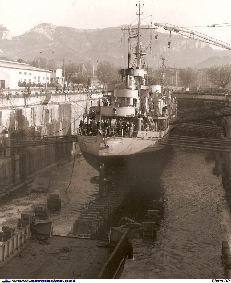 ![]() Criquet le jour de la mise en eau précédant la sortie des bassins Missiessy à Toulon. En arrière-plan, on distingue une gabare type AN construite pendant la 2ème guerre mondiale et transférée par les Etats-Unis (1970 - photo Francis Lamy).