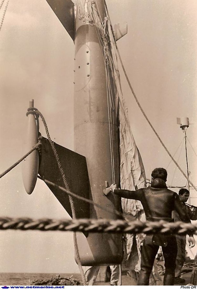 d'un missile Malafon d'exercice qui, après séparation de la torpille, a fini sa course à la mer sous un parachute (1970 - photo Francis Lamy).