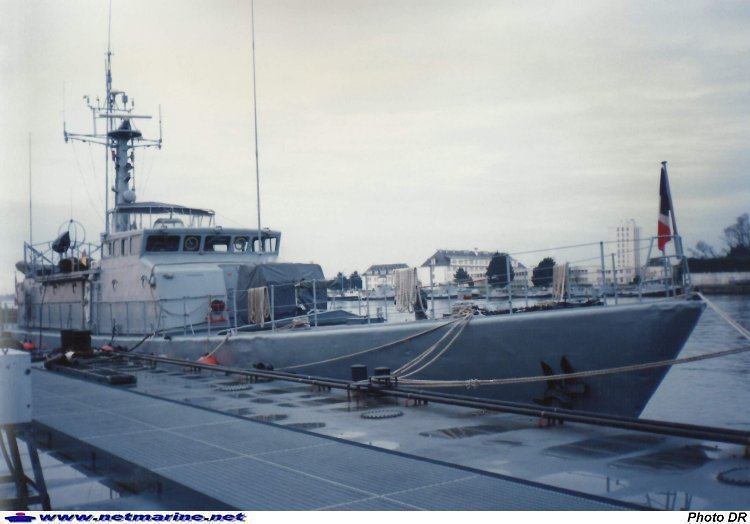 à quai à Lorient entre deux patrouilles. En arrière-plan, les locaux et la batellerie de la DP ou Direction du Port (photo Philippe Gireaud - 1994).