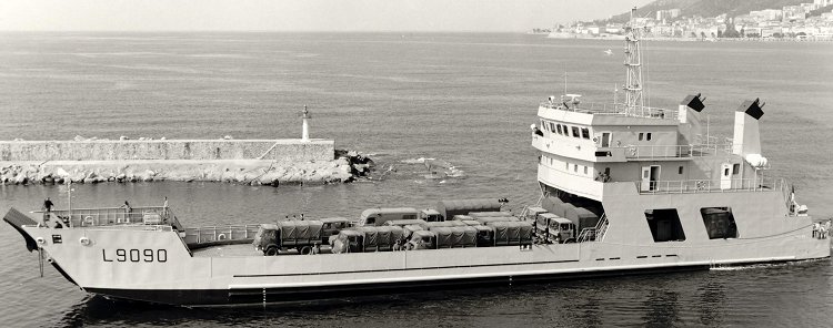 doté d'une porte d'étrave manœuvrée par câble et charge son