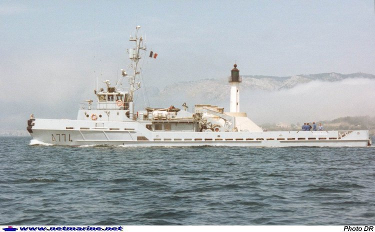 franchissant les grandes passes donnant accès à la rade Toulon. La mission qu'il vient d'achever a certainement nécessité le démontage du portique (2002 - Luc Bénéteau).