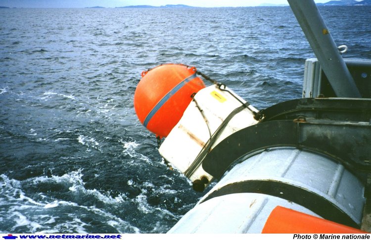 ![]() Le bâtiment de soutien de région Gazelle mouillant des mines à orin. Le crapaud, socle en béton, reposera sur le fond de la mer et la mine flottera entre deux eaux reliée par un câble. Le champ de mines ainsi constitué servira à l'entrainement très réaliste des chasseurs (date inconnue).