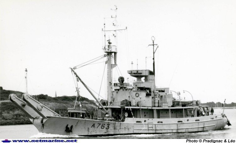 passant devant l'île Saint-Michel en rade de Lorient. Un coffre avec marque spéciale occupe le pont de travail (23 juillet 1981).