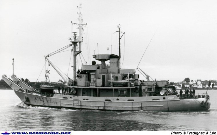 en rade de Lorient. Un coffre avec marque spéciale occupe le pont de travail (23 juillet 1981).