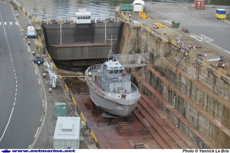 en carénage au bassin à Brest. La coque a été totalement décapée et vient de recevoir ses couches de peinture primaire (7 mai 2006).