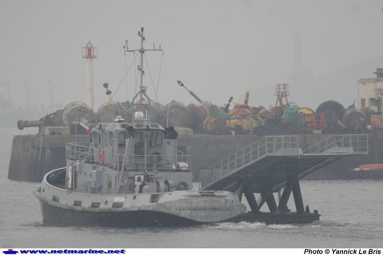 remorquant à couple l'un des 6 éléments du pont flottant Tréhouart destiné à améliorer la circulation en Penfeld (27 mars 2007).