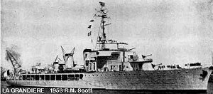 C'est le 11 septembre, que la frégate de la Royal Navy Mounts Bay appareilla de Pusan pour rejoindre en mer le gros des forces de débarquement au large de la côte Ouest de Kyushu. Notre rôle était d'assumer une mission d'escorte et de protection en compagnie d'autres frégates: HMS Whitesand Bay (F 633), Morecambe Bay (F 624) ainsi que des Néo-Zélandais HMNZS Tutira (F517) et Pukaki ( F424). Nous rejoignîmes plus tard le Français FMS La Grandière puis les frégates américaines USS Bayonne, USS Newport et USS Evansville. Heureusement la mer et le vent s'étaient calmés, permettant une navigation plus confortable dans la traversée de la Mer Jaune vers notre ultime destination, le Chenal du "Poisson Volant" conduisant à Inchon. Dès le 13, la cadence et l'intensité des bombardments navals et aériens s'accrut fortement. Vînt s'y ajouter les croiseurs légers HMS Jamaïca et Kenya qui eurent la tâche de détruire cinq batteries côtières de 76 mm sur l'île de Wolmi Do, dominant l'entrée du port d'Inchon. Le CV J.H. Unwin RN, DSC, commandant du Mounts Bay, reçut la responsabilité de constituer un écran extérieur de protection d'environ 50 nautiques de long sur 40 de large vers le Sud des passes d'Inchon. La mission était d'empêcher toute pénétration ennemie vers la zone de débarquement tant par bateaux, que par embarcations suicides, nageurs de combat, mines flottantes, et de prévenir tout mouvement de l'ennemi entre les îles et le continent, ainsi que d'assurer le sauvetage des équipages d'avions abattus. Sous le commandement du CV Unwin, on retrouva le Whitesand Bay et le Morecambe Bay, avec le RNZS Tutira (ex Loch Morlich), le RNZS Pukaki (ex Loch Achanal) tous deux frégates de la classe "Loch" armées d'un seul canon de 4 pouces, de 20mm et 40mm AA et de deux systèmes squid AS. La participation US dans cet ensemble était assurée par les USS Bayonne, Newport et Evansville qui étaient des corvettes de la classe "Ashville" (classe Lend Lease River), disposant chacune d'un armement léger de trois canons de 3 pouces et de dix 20mm AA ainsi que de grenades sous-marines. Le dernier maillon (last but not least) de cet écran était le (French Motor Ship) FMS La Grandière, un aviso colonial de quelque 2.600 tonnes (pc) armé de trois canons de 5,5 pouces (138mm) en tourelle simple ainsi que de onze 20mm oerlikon et quatre 40mm bofors AA, de grenades sousmarines (66). (DonGiles avait écrit: le Mounts Bay et le La Grandière avaient déjà assurés côte à côte de nombreuses missions d'escorte et de protection de convois et, au repos au port, les équipages n'avaient pas manqué de cimenter ces bonnes relations de travail par des échanges de rhum, de vin, de cigarettes gauloises et de bonne hospitalité mutuelle. Le mélange de vin rouge avec le rhum produisait un concentré explosif d'au moins 200% d'indice d'octane ressemblant plutot à du carburant d'aviation qu'à une boisson à boire entre amis, mais cependant tellement appréciée de chacun. Texte non édité ...) Pendant le débarquement du 15 septembre, les équipages des bâtiments du screening group étaient à leurs postes de combats, attentifs à toute réaction des troupes Nord-Coréennes. Le lendemain à 20h 30, notre radar de veille repèra un bateau qui ne répondit pas à nos signaux lumineux. Notre tourelle "B" ouvrit le feu avec six rockets éclairantes de 2 pouces. Nous pûmes ainsi identifier un dragueur ROK (Republic Of Korea) en train de rejoindre la flottille dont nous avions la protection et opérant dans les passes d'Inchon... Le 18, le Mounts Bay et le La Grandière se mirent à tirer au 40mm bofors sur des mines flottantes, en détruisant quelques unes. Les Coréens du Nord larguaient dans les courants des mines de contact fabriquées par les soviétiques en utilisant pour celà des jonques et des sampans. Le 25 septembre, comme les forces des Nations Unies étaient sur le point d'investir Séoul et que la jonction avec les éléments de la 8ème Armée venant du Sud était imminente, les priorités navales furent ré-étudiées et le dispositif de l'écran de protection réaffecté. Le Mounts Bay vînt s'amarrer à couple de l'USS Winston (AKA94) dans le port d'Inchon pour avitaillement. La réorganisation tenait compte du fait qu'il était devenu hautement nécessaire de faire face au danger créé en mer, tant par les mines mouillées que par les mines flottantes. Cinquante quatre mines avaient été vues rien que par notre groupe. Deux destroyers US, l'USS Mansfield (DD 728) et l'USS Brush (DD 745) ainsi que deux dragueurs ROK de la classe Albatross devaient sauter sur des mines et être plus ou moins gravement endommagés. L'USS Magpie (AMS25) fut coulé par mine, au large de Pohang. En dehors des dommages causés aux navires, il y eut des victimes dans les équipages et celà était une menace permanente pour tous les Marins. À bord du La Grandière Nous pûmes voir un bâtiment US qui avait sauté sur une mine et constater de visu ce qu'une mine peut causer comme dommages à un bateau. C'était probablement l'USS Brush (DD745). La proue était détruite. Un de nos marins se rappelle parfaitement de ce qu'il a vu: "...tout l'avant y compris la première tourelle avait disparu, comme coupé à la scie. Cependant le bateau avançait à petite vitesse par ses propres moyens. La poupe se dressait en l'air et les hélices étaient quasiment hors de l'eau..." Un autre ajoute: "Il y avait de nombreuses victimes, peut-être une cinquantaine... et je crois qu'il y avait au moins cinq marins tués... C'était tout à fait possible, car comme dans notre Marine, les postes d'équipage sont placés à l'avant des bateaux, non loin des soutes... Dieu ait leur âme!" À bord du Mounts Bay Les mêmes bâtiments qui avaient été affectés à des missions de protection dans l'écran au large d'Inchon se retrouvèrent presque tous dans le Groupe de dragage de mines TG 95.6 sous le commandem