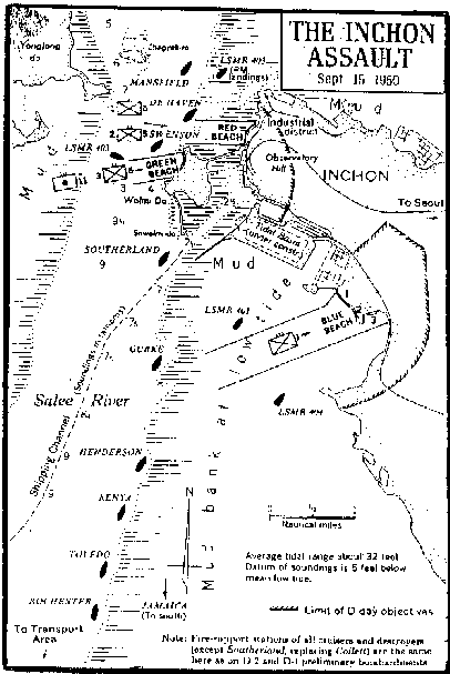 navals et aériens 14 Septembre 1950 : D Day -1 Le matin, des éléments du TG 90.6 se forment en colonne et remontent à nouveau le chenal du Poisson Volant vers Inchon. L'USS Mansfield DD728 est en tête de la ligne des destroyers. Vers midi, les croiseurs canonnent la zone d'Inchon. L'aviation attaque Wolmi Do. L' USS Mansfield et les destroyers sont à leurs positions assignées pour bombardement d'objectifs pré-identifiés dans la banlieue proche au Nord-Est d'Inchon. Puis, comme la veille, les destroyers s'en retournent rejoindre le TG 90.6 et reprennent leur place dans l'écran A/S.