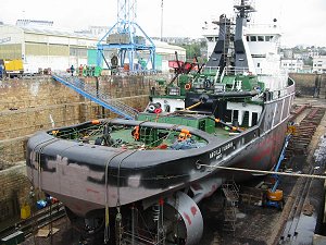 L'Abeille Flandre a remplacé, le 15 avril 2002, sur la ligne de tins de la cale numéro 1 du port de commerce, le cargo l'Armorique, de l'Agence maritime de l'ouest, sorti le même jour et qui terminera à flot les travaux commencés le 2 avril. Outre les travaux de sablage et de peinture de la carène, le passage en bassin permettra de vérifier les lignes d'arbre et les deux hélices à pales orientables. Les 4 moteurs diesel seront également l'objet d'une visite d'entretien ainsi que les treuils, soumis à rude épreuve lors des opérations de remorquage. Le bateau sera remplacé durant son immobilisation par le navire supply Alcyon, de la compagnie Surf-France, affrété lui aussi par la Marine nationale. D'une puissance moindre que celle de l'Abeille Flandre (deux moteurs de 2.600 cv contre quatre de 3200) l'Alcyon a été construit à Dieppe, en 1981, par les Ateliers et chantiers de la Manche. Mars