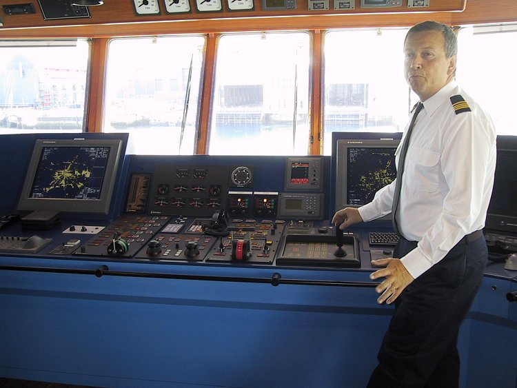 Le commandant Potrel à la passerelle du remorqueur de haute mer