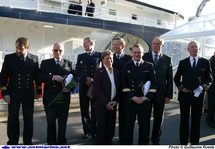Autour de la marraine Annie Blanchet et de son fils, le préfet maritime, et les deux commandants de l'Abeille Liberté, quelques minutes après son baptême (17 novembre 2005).