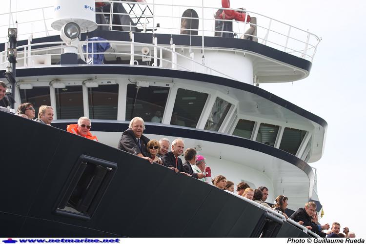 A cotè de l'Evêque du Havre, le maire Antoine Rufenacht et le sous préfet Gilles Lagarde à bord du remorqueur de haute mer