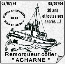 Ils avaient pour nom : Actif, Courageux, Hercule, Laborieux, Le Fort, Lutteur, Travailleur, L'Utile, Valeureux. C'étaient les remorqueurs côtiers de puissance 1000 chevaux ; les " mille " comme on les appelait. Moi, l'Acharné, je suis le dernier survivant de ce type encore en activité. J'ai été construit par les chantiers " La Perrière " à Lorient et admis au service actif en 1974. Voici mes caractéristiques : longueur 28 mètres, largeur 8 mètres, tirant d'eau 4 mètres . Basé à Cherbourg sous le commandement organique de la base navale, je viens donc de fêter mes trente ans le 5 juillet. Trente ans, le bel âge ! Mon copain le Lutteur a pris sa retraite en 1999, il m'a laissé un peu orphelin dans le bassin Charles X. Je promène ma silhouette trapue du Mont Saint Michel à la frontière belge . J'ai eu la chance de visiter quelques ports du Royaume-Uni , de Belgique, des Pays bas et des îles anglo-normandes. En France, au cours de mes missions de surveillance, Granville, Fécamp, Dieppe et Dunkerque m'accueillent toujours à bras ouverts. L'équipage a toujours autant de plaisir à me faire visiter par la population. Ce qui intrigue le plus les visiteurs est de savoir comment vivent les marins dans un espace si restreint.