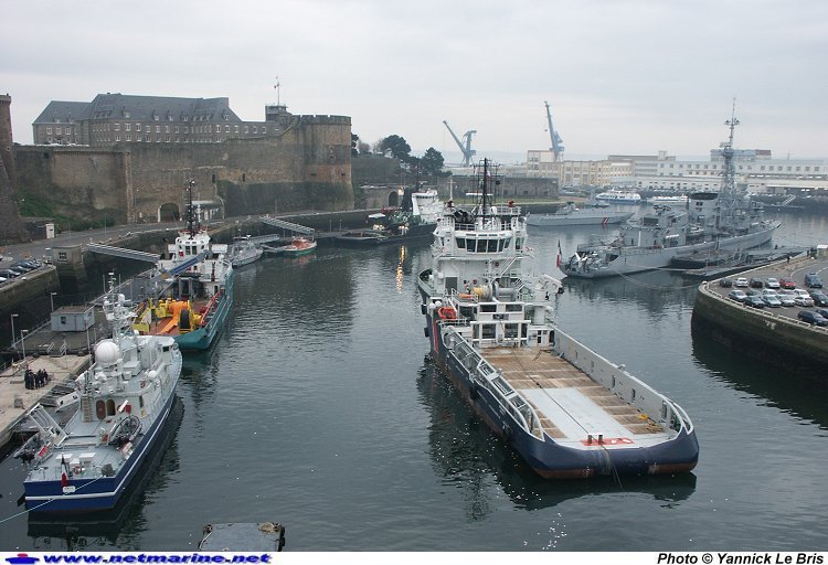 ![]() Magnifique photo en Penfeld à Brest. Au premier plan à gauche le patrouilleur des Affaires Maritime Iris, à sa droite le bâtiment de soutien, d'assistance et de dépollution (BSAD) Argonaute ; devant l'Iris l'Ailette puis l'Abeille Flandre. Au fond à droite la frégate Primauguet, et un patrouilleur de service public (février 2004).