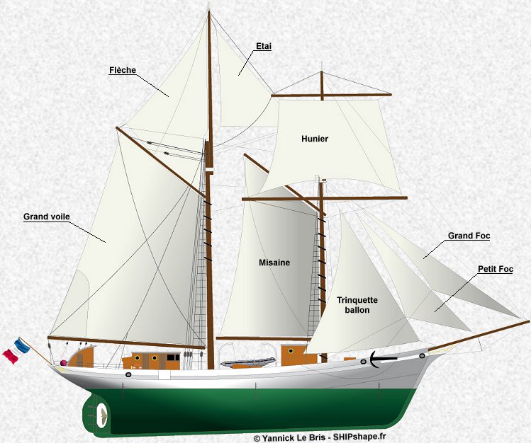 Grand foc, Petit foc, Trinquette, Misaine, Hunier, Etai,