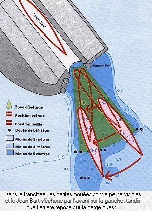 Cette première manoeuvre s'effectue sans encombre. Mais, dans la tranchée, les petites bouées sont à peine visibles et le Jean-Bart s'échoue par l'avant sur la gauche, tandis que l'arrière repose sur la berge ouest... Après trois quarts d'heure d'effort, les remorqueurs réussissent à dégager le navire, qui finit par atteindre le chenal de la Loire aux premières heures de l'aube. Sauvé ? pas encore! A 4 h 40, trois bombardiers allemands se présentent à tribord, à 1 000 mètres d'altitude. Un chapelet de bombes explose au contact de l'eau à cinquante mètres sur l'avant des remorqueurs. Nouvelle passe, nouveau chapelet, sans résultat. Un troisième appareil revient seul et met au but. Une bombe de 100 kg explose entre les deux tourelles de 380. La fumée se dissipe, les dégâts sont insignifiants. Un trou de 20 centimètres et quelques cloisons soufflées. Une quatrième attaque, trois appareils salués par une D.C.A. intense. En fait, ce sont les chasseurs français, en retard au rendez-vous. A 6 h 30. le Jean-Bart est rejoint par deux torpilleurs d'escorte et, à 11 heures, il accoste au pétrolier Tam pour ravitailler en eau et en mazout. A 18 heures, le cuirassé fait route sur Casablanca. Un instant, le commandant Ronarch a été tenté d'interrompre le ravitaillement, mais un pressentiment l'a fait renoncer à son projet. Bien lui en a pris. A l'heure et à l'endroit prévus pour le nouveau ravitaillement, un sous-marin allemand a envoyé un bâtiment de commerce par le fond ! Après de nouveaux incidents techniques, le Jean-Bart réussit à filer 24 noeuds et arrive dans le grand port marocain le 22 à 19 h 30. Témoignage d'un marin sur le Jean Bart Monsieur LEGRAND Albert Louis (né le 15/03/1920 à Comines (Nord)) Né le 15 Mars 1920, je me suis engagé volontaire dans la Marine le 25/05/1937 à Cherbourg comme infirmier (Matricule 1429 c.37) 6 mois de cours, je suis sorti le 25/12/1937 premier de ma promotion. Resté 6 mois à Cherbourg en salle d'opération comme infirmier anesthésiste, j'ai permuté pour Lorient dans le même poste et le même emploi jusqu'au 1er Juin 1940. Entre temps pendant le risque de guerre en septembre 1938, j'ai appris à Melle de Penfetenie (fille du préfet Maritime du Morbihan) à courtiser j'avais 18 ans et cinq mois. Le 1er juin 1940 j'ai été nommé, comme quartier-maître, sur le Jean-Bart (en cours de construction à St Nazaire Penöet. Les allemands étaient près de Paris. Nous avons formé une patrouille de débarquement jusque La Baule. Départ le matin, déjeuner sur place et retour le soir jusqu'au 17 juin où nous avons embarqué par la grue puisque la passerelle avait été levée (les allemands étaient à la porte de St Nazaire). Départ le 18 à marée haute mais l'électricité étant en passe nous avons été retardé de 1 heure environ ( la marée redescendait) et en sortant nous nous sommes mis à sec (toujours pas d'électricité) l'ancre avait été descendue. Tout le monde sur le pont aux commandes manuelles du gouvernail pendant que les avions nous bombardaient (2 bombes sont tombées à l'avant et se sont écrasées sur le cuirassé après avoir traversé le pont. Remorqué par 2 remorqueurs, l'un d'eux s'est enfui, nous avons déversé le mazout pour nous alléger et en route vers 7h00 pour la pleine mer, où nous avons été ravitaillé par le Tarn accompagné d'une flotille de ses sous-marins. Vers 10h00 alors que deux sous-marins attendaient pour nous torpiller et sans doute perdant patience, nous fûmes rejoint par le torpilleur tout neuf comme nous tout rouge de mimium et venant de Brest. Au large dans l'après-midi du 18 juin, en pleine mer, nous avons entendu l'appel du Général de Gaulle qui était à Londres et qui demandait à notre Commandant le Capitaine de Vaisseau Ronach ; (neveu de l'amiral Ronach) qui avait fait la guerre de 14-18 à Dixmude (Belgique); de choisir sa destination soit l'Angleterre, soit l'Afrique du Nord. Notre Commandant opta pour le Maroc (Casablanca) ou nous arrivâmes en louvoyant le 24 ou 25 juin et restions bloqués au large, jusqu'au départ d'un autre navire qui nous laissa sa place à quai. Restés 6 ou 7 mois à Casablanca nous en profitâmes pour faire une fête à bord, alors que notre Commandant avait été nommé Général. A l'issue de cette fête l'amiral qui était en quarantaine et qui me voulait comme infirmier nous invita dans son carré pour nous offrir le champagne. Arrivant à ma hauteur, il trinqua en me disant : " C'est meilleur que toutes les saloperies que tu nous a fourré dans la gueule pendant 15 jours." (histoire que j'ai raconté à sa fille en 1950 à Paris et qui m'a dit, que c'était bien une sortie de son père. Au mois de Janvier je permutais en quartier Maître au Montcalm qui était basé à Dakar et j'ai perdu de vue mon cuirassé. Albert LEGRAND
