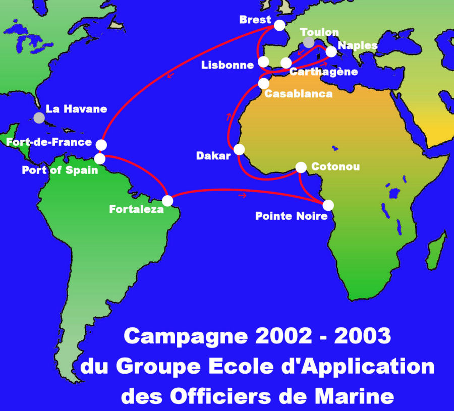 Les points gris représentent les escales réalisées par le bâtiment accompagnateur en solo.