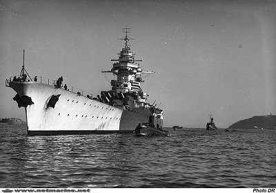 Il quitte Brest le 18 juin 1940, juste avant l'arrivée allemande, convoyant une division de croiseurs auxiliaires avec un précieux chargement d'or (2000 tonnes d'or provenant de la Banque de France, les réserves d'or de la Belgique et de la Pologne en exil). Le convoi arrive à Dakar le 28 juin puis est immobilisé par l'armistice. Dès juillet, les Britanniques veulent s'emparer des navires français présents en Afrique occidentale. Devant l'hostilité des autorités françaises, les Britanniques passent à l'attaque et dans la nuit du 7 au 8 juillet les Swordfish du HMS Hermès attaquent le cuirassé qui est atteint par une torpille qui met hors service une de ses deux lignes d'arbres tribord et ses moteurs de barres principaux, immobilisant ainsi le navire.