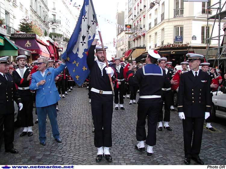 rue des Abesses à Paris en compagnie du célèbre Michou (photo Bagad de Lann Bihoué 2005)