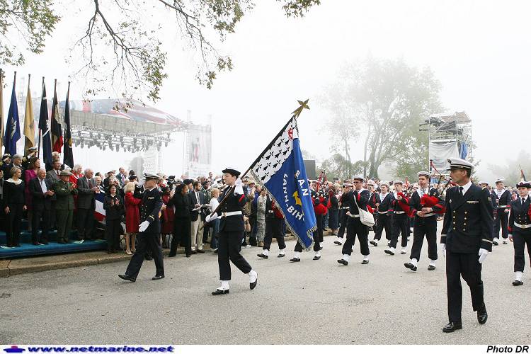 défile devant le ministre de la Défense Michèle Alliot-Marie à l'occasion des 225 ans de la victoire de Yorktown (photo Bagad de Lann Bihoué octobre 2006)