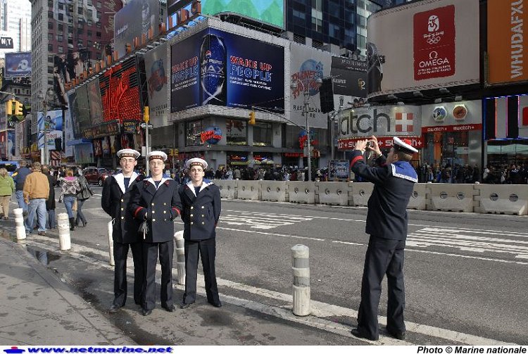 Quelques marins du porte-hélicoptères Jeanne d'Arc à Times Square lors de l'éscale de New York (30 décembre 2007 photo Marine nationale - second maître Lucas )