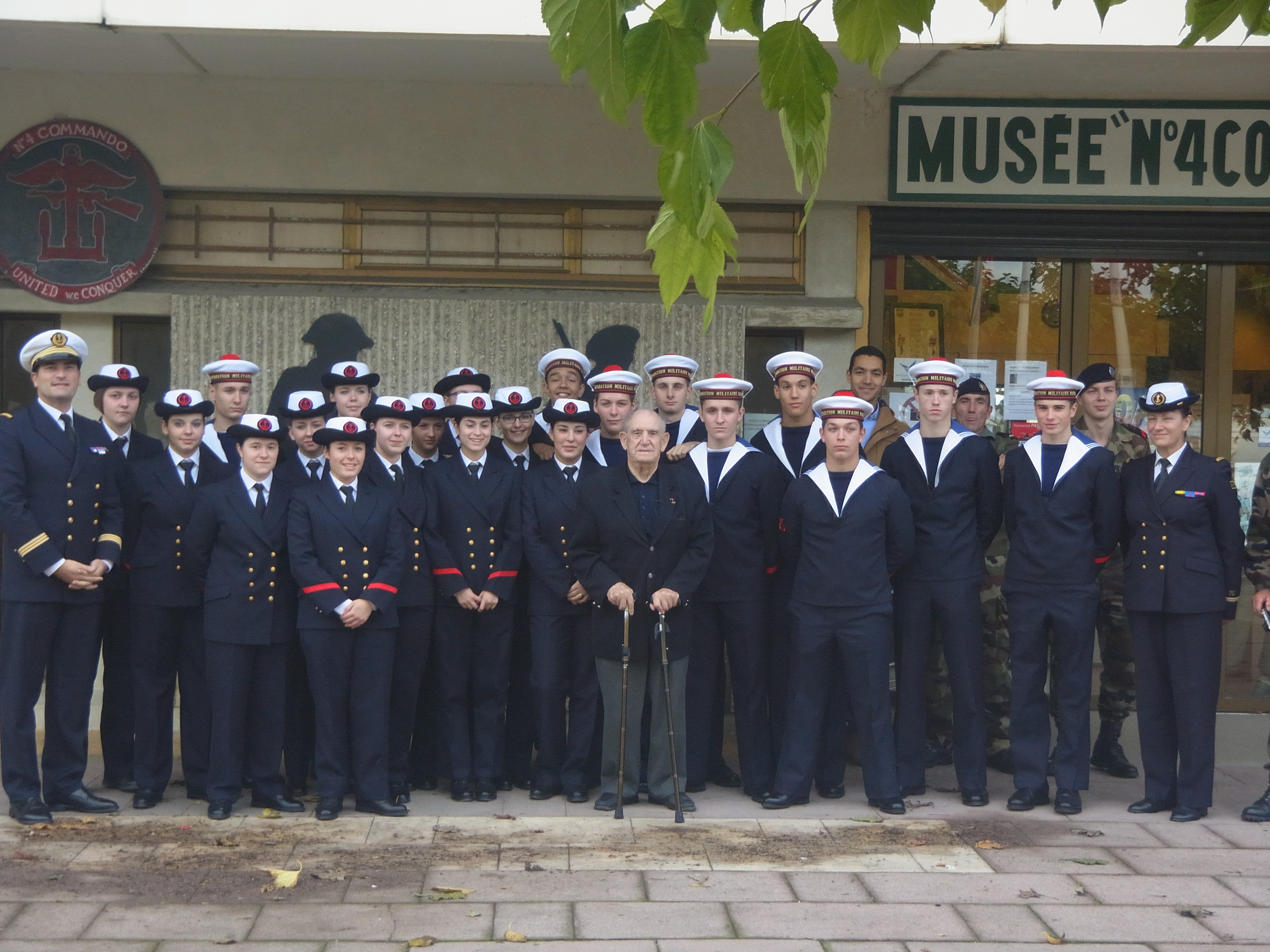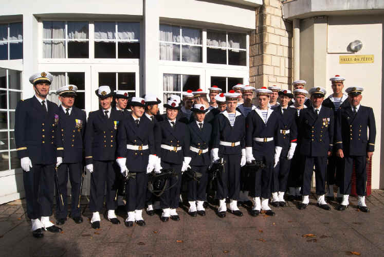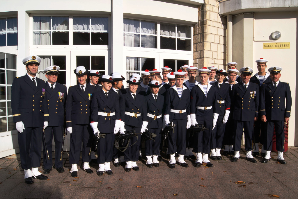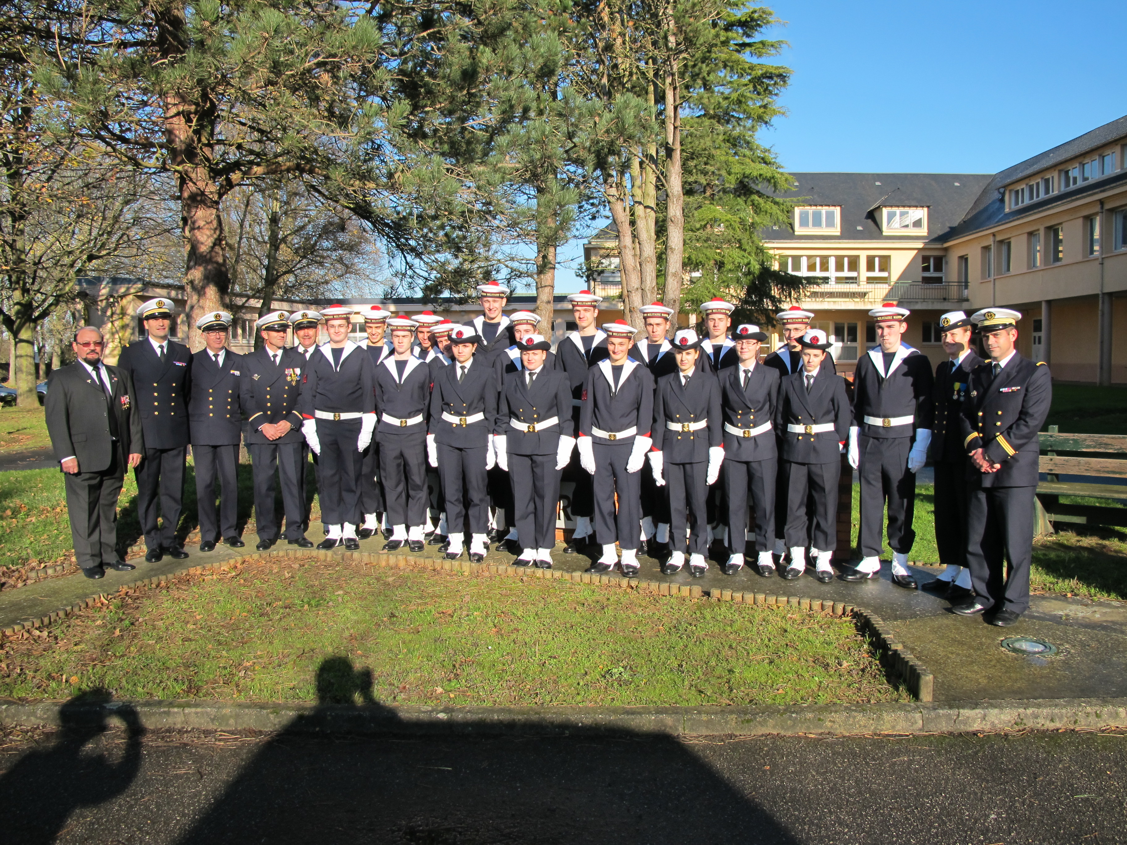 photo de la PMM de Caen-Epron (sont présents les instructeur, le pacha du Flamand parrain de la PMM "amiral HAMELIN" et le président des anciens combattants d'Epron |