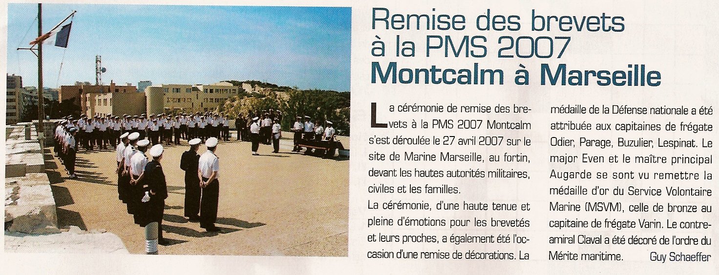 les hautes autorités militaires, civiles et les familles. La cérémonie, d'une haute tenue et pleine d'émotions pour les brevetés et leurs proches, a également été l'occasion d'une remise de décorations. La médaille de la Défense nationale a été attribuée aux capitaines de frégate Odier, Parage, Buzulier, Lespinat. Le major Even et le maître principal Augarde se sont vu remettre la médaille d'or du Service Volontaire Marine (MSVM), celle de bronze au capitaine de frégate Vanini Le contre-amiral Clavai a été décoré de l'ordre du Mérite maritime. Guy Schaeffer Cols Bleus - N°2832 du 16 juin 2007