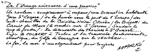 Peintre titulaire de la Marine en 1988 Chevalier du Mérite Maritime Membre de l'Académie Arts, Sciences, Lettres Président des Peintres officiels de la Marine Chevalier de l’ordre national du Mérite. Expositions permanentes Galerie Jean de Chatillon - 1, place Jean de Chatillon - 35400 Saint Malo (Tel : 02 99 40 29 78) Galerie 23 - 16, rue du Dr Cornudet - 56130 La Roche Bernard (Tel : 02 99 90 90 72) Autres lieux où l'on peut voir les oeuvres de Serge Marko (sur rendez-vous) : Atelier - 3, place Boulnois -75 017 Paris (Tel : 01 42 27 91 91) Biographie 4 années d'études artistiques aux Arts Appliqués à l'industrie et aux Académies Frochot à Pigalle et de la Grande Chaumière à Montparnasse, ainsi qu'aux cours libres de l'Ecole des Beaux-Arts. Après avoir travaillé dans le domaine du parfum et des grands groupes industriels, Marko, créé en 1959, l'un des trois plus important studios d'arts graphiques à Paris qu'il transforme plus tard en agence de publicité. Pendant toutes ces années, sa vie sera dominée par la peinture, le dessin, la sculpture et la gravure. En 1978, le Salon du Petit-Format lui décerne le ler prix pour une pointe-sèche. Puis, la même année, il remporte la médaille d'Or pour sa lère représentation au Salon des Artistes Français, suivie d'une médaille de Bronze au Salon de la Marine. Cette dernière allait changer son destin puisque, depuis, Marko ne cesse d'embarquer vers des horizons toujours changeants et toujours plus lointains, et est devenu rapidement Peintre Officiel de la Marine, en 1983. Ces mouvances n'interdisent pas son travail de paysagiste sur la terre ferme, soit en "reportages thématique" (Paris, Provence, Venise. Polynésie, Antarctique, Terres Australes, etc.) soit comme portraitiste, soit sur d'importantes études de nu, Enfin comme correspondant de guerre (Guerre du Golfe, Kosovo,...) Ses goûts pour la perspective, la ligne et le détail l'entraînent sur des sujets architecturaux (par ex., études sur l'Ecole Militaire, le Chemin de Fer, le Nucléaire, la pétrochimie, etc...) Il est des vocations impérieuses sur lesquelles l'âge n'a pas de prise. Serge Markô, enfant, se promène dans ce qui fut le cinéma Pathé, près de la gare Saint-Lazare. Il regarde émerveillé la présentation de l'expédition de la "Croisière Noire" (Citroën). A côté, sur fond de poutrelles, de rails et de fumées, les trains vont et viennent.