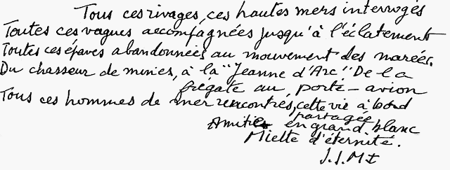 Parce que "quoi de plus beau et de plus positif que le langage des marins ?". Il ne s'agit que d'atteindre à l'exécution la plus prompte et la plus sûre, dans les circonstances les plus diverses, on sait ce que l'on veut. Et que l'artiste, lui, comme le dit Valéry, échange à chaque instant ce qu'il veut, contre ce qu'il peut, et ce qu'il peut, contre ce qu'il obtient. Parce que jamais ne finira pour moi le dialogue du ciel et de la mer. Parce que dans mon pays, sur la côte, quand naissait un fils, une coutume ancienne voulait que 1'on mette quelques gouttes d'eau de mer sur ses lèvres. Parce que dans mon pays tous les chemins mènent à la mer. Et qu'ici on ne meurt pas on est "déshabillé de la vie" Jean-Jacques Morvan in "La mer et l'acte de peindre"
